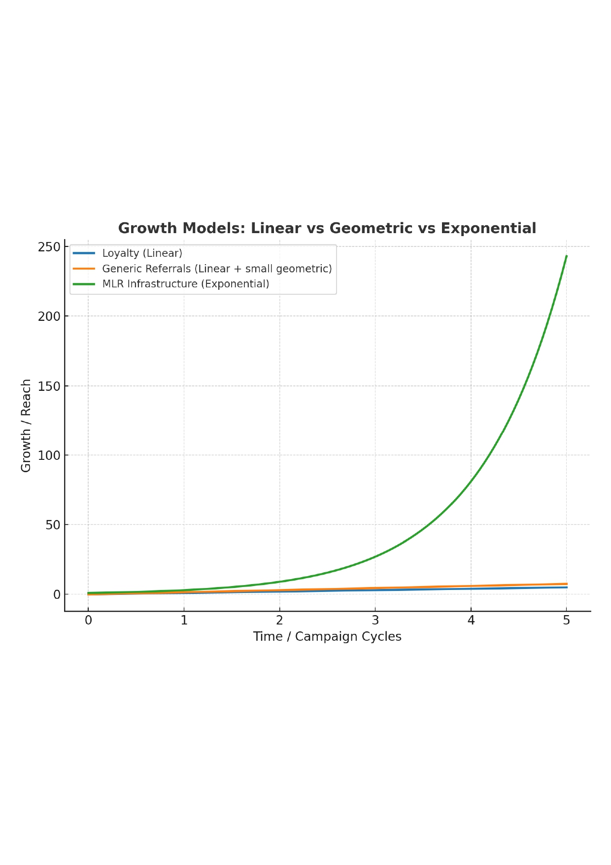 Loyalty programs are linear: consume → earn → repeat. Generic referrals are still linear, with a slight geometric effect—one person might bring two, but only once per campaign. At best, the industry standard success rate is ~3n. Multiple-Loops Referrals are exponential: 3ⁿ—with best-case success rates up to 82%, nearly 30x higher than the industry’s best. A single ignition can trigger a chain reaction of advocates across multiple layers, multiplying growth at a speed loyalty programs can’t touch